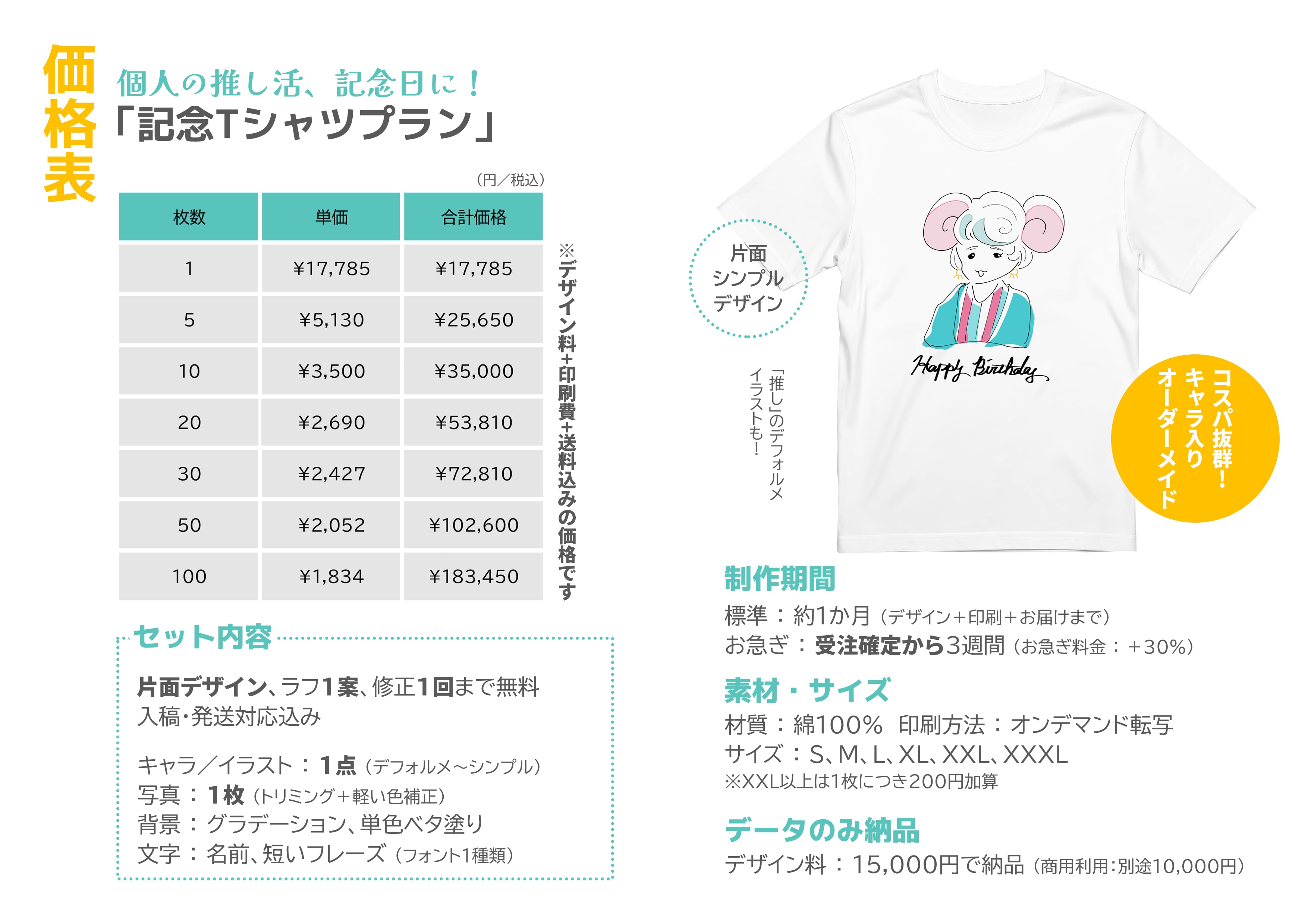 個人のお客さまでも1枚から気軽に作れる、オリジナルTシャツプランをご用意しております。