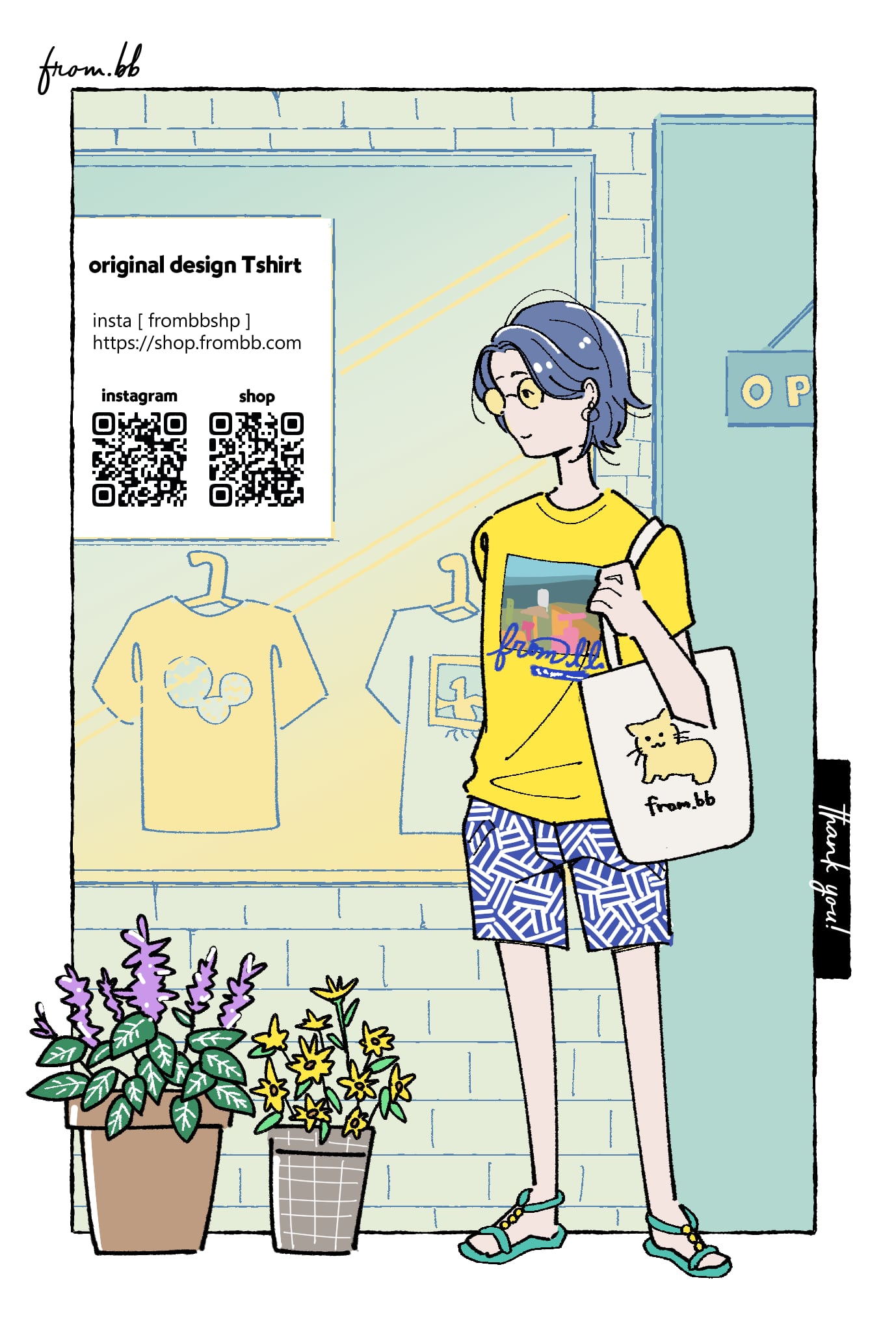 ブランドのTシャツ、トートバッグを身につけたデザイナーbbがモデルになっています。