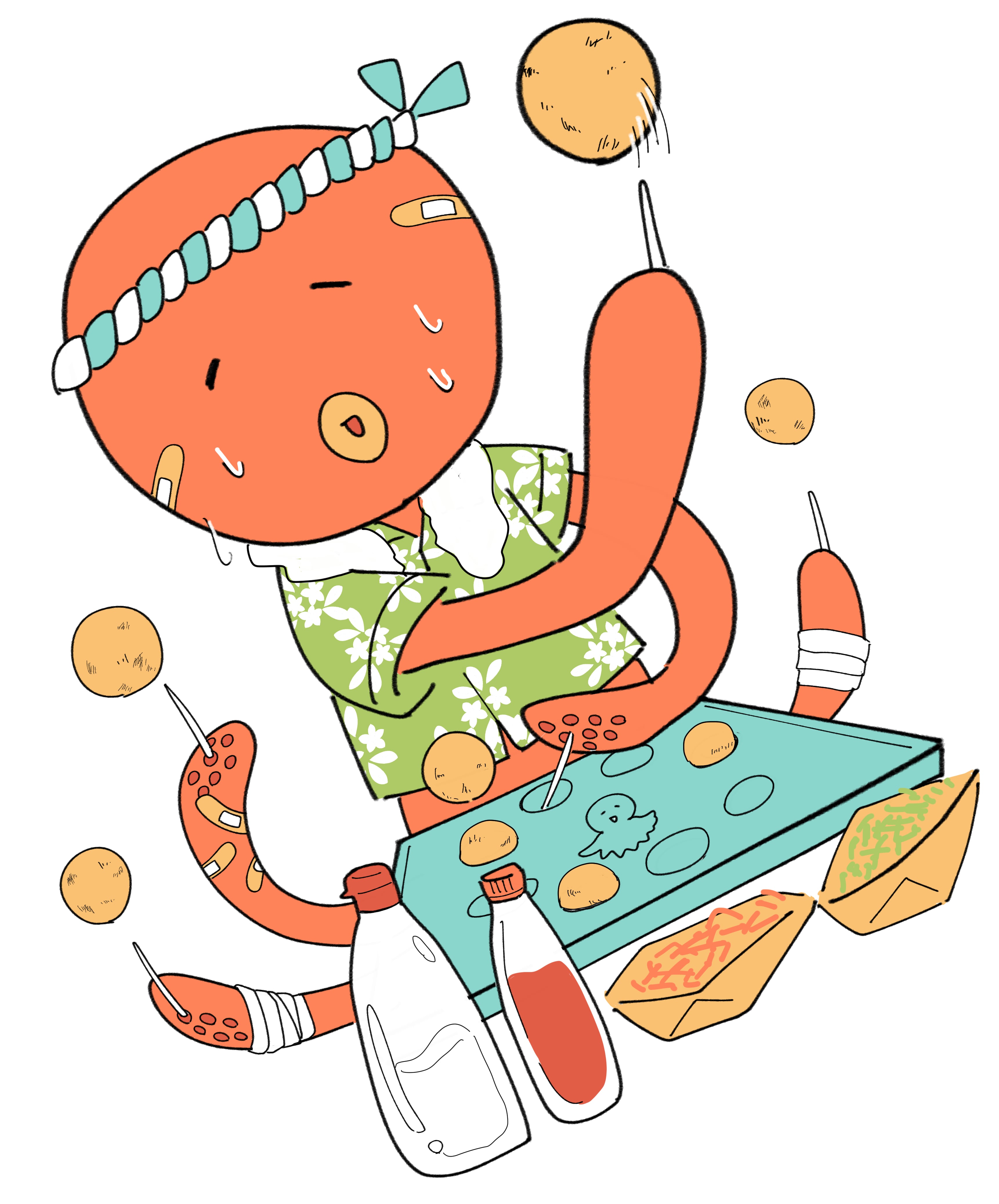 汗だくになり、謎のケガを負いながらも笑顔でたこ焼きを焼くタコ。やさしさとは何か、幸せとは…さまざまなことを考えさせられる哲学的な一枚です。
